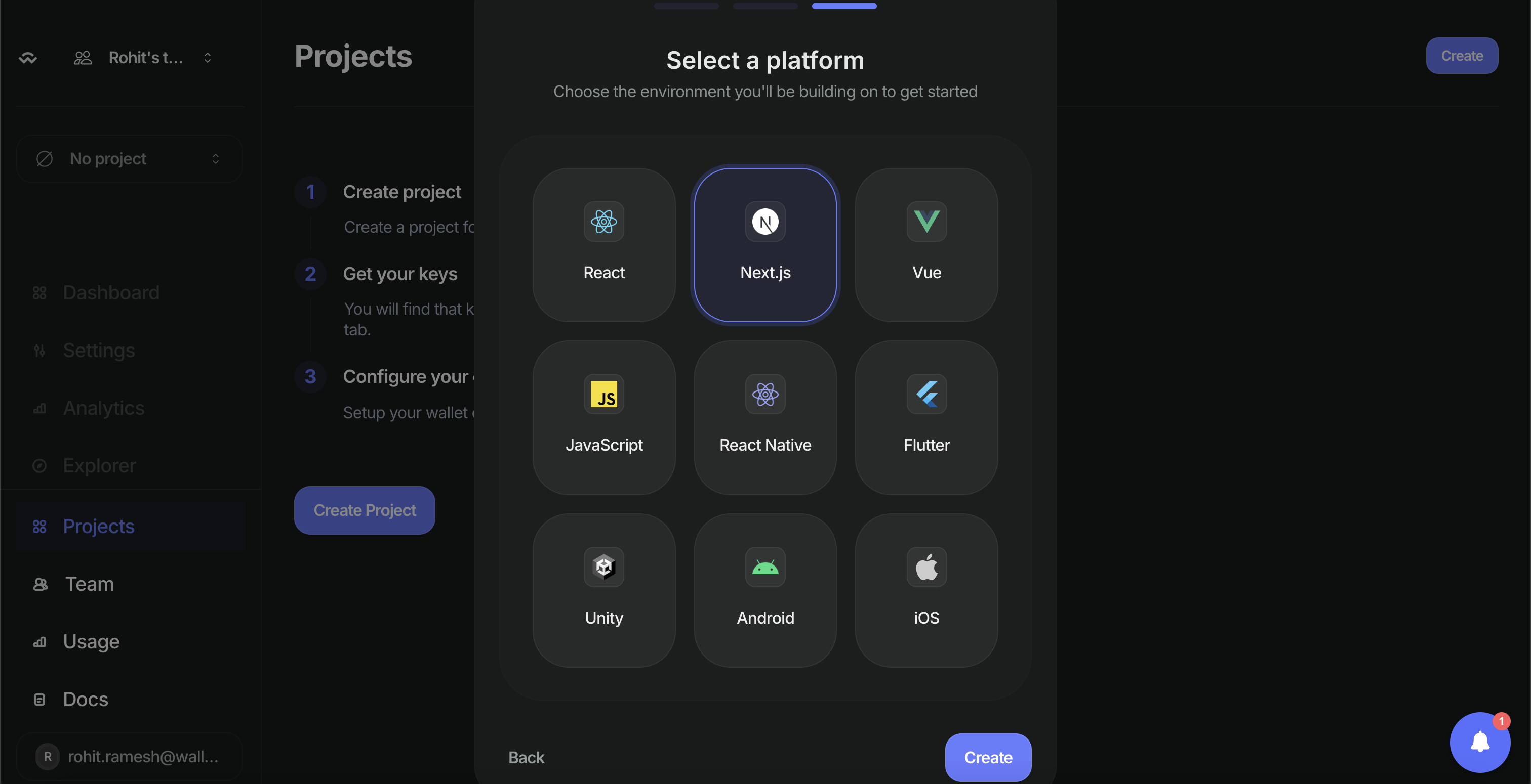 Select the framework as “Next.js” and click on Create. Reown Cloud will now create a new project for you which will also generate a project Id.